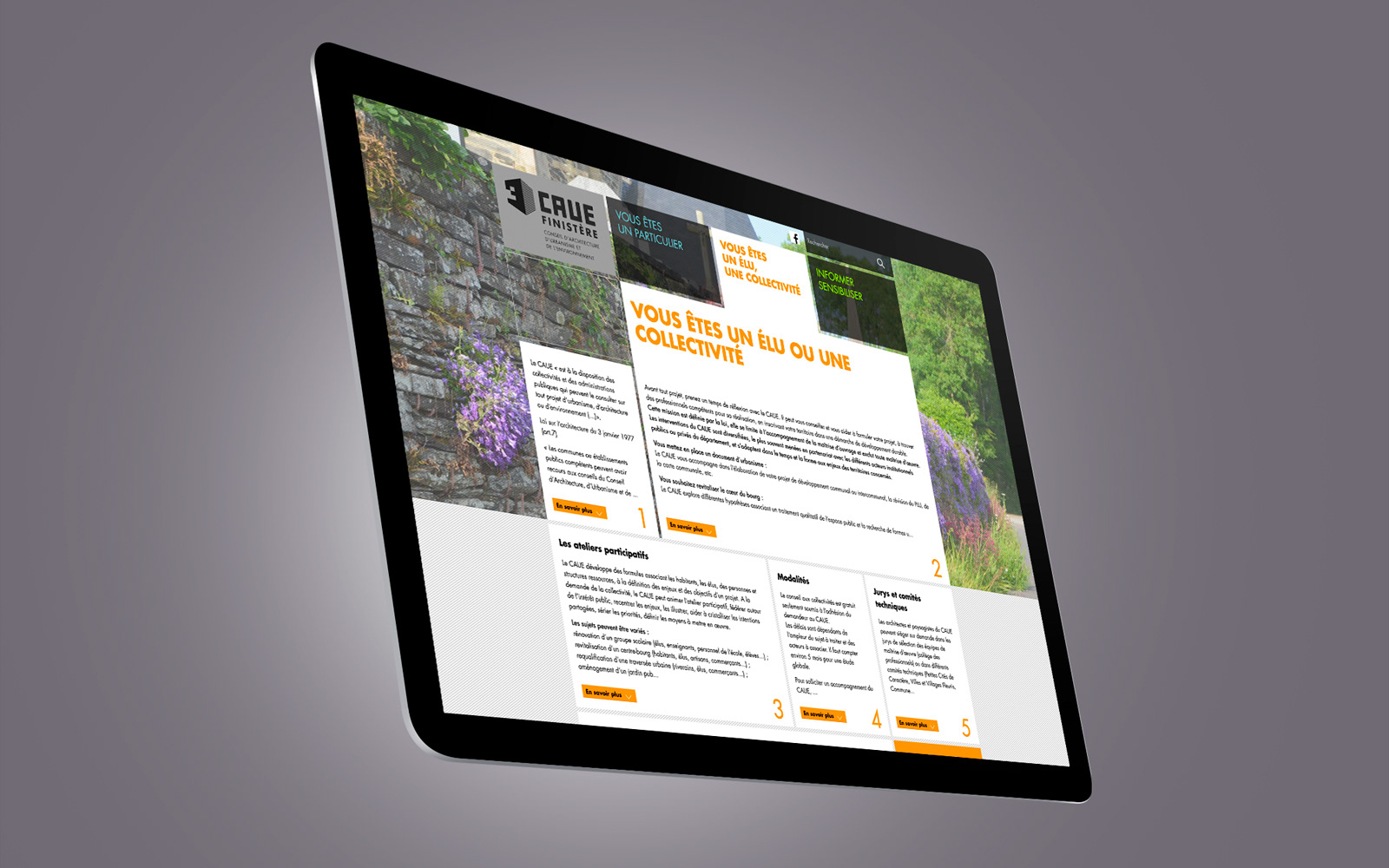 Création du site web du CAUE du Finistère, le Conseil d'architecture, d'urbanisme et de l'environnement du département. Le design est basé sur une grille très structurée, développant un système graphique qui identifie fortement l'institution.