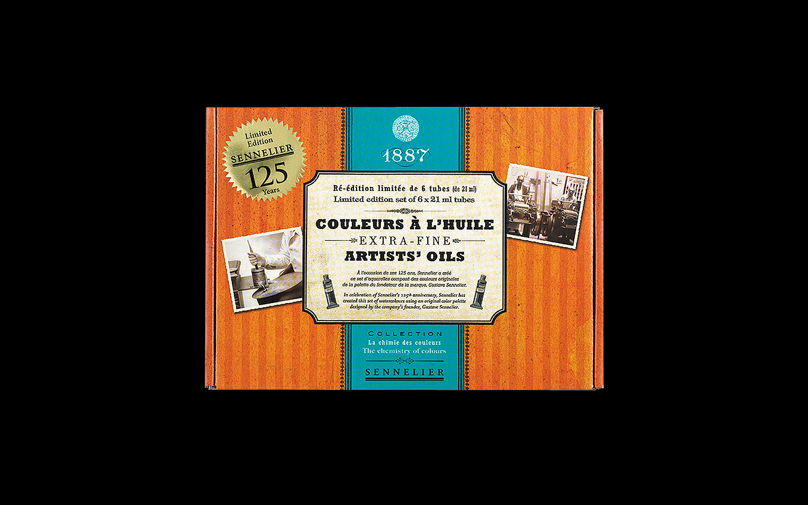 astels, Création des coffrets Sennelier pour le 125e anniversaire de la marque. Packagings pour le marché américain : pastels gras et secs, peinture à l'huile et aquarelle. Graphisme, typographie dans un style d'époque.